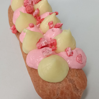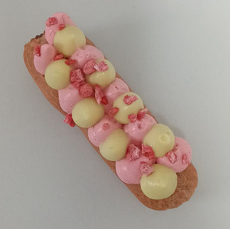 Garnir l'intérieur des éclairs avec la mousse framboise, puis pocher dessus en alternant la ganache choco et la mousse pralines roses.